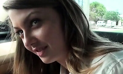 Dashing brunette spread her legs in the back seat of a taxi and is waiting for the driver to take her cheque