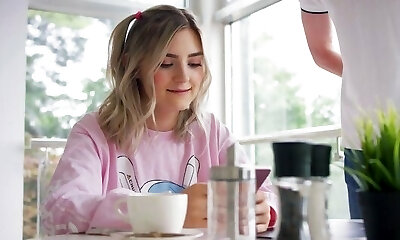 súper lindo ash blonde babe kate de inglaterra da pecho golpeando y se rompe para arriba en la cocina